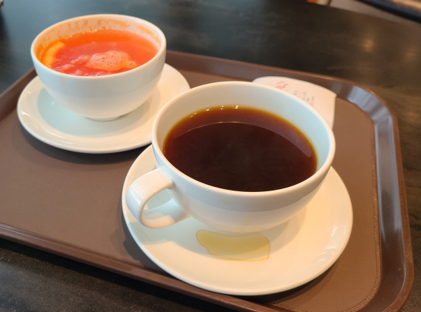 카페에서는 커피와 주스, 티 등의 음료와 초코, 치즈, 당근 케이크 등의 디저트를 판매하고 있습니다. 가격은 아메리카노가 7000원 아이스 아메리카노는 7500원, 케이크가 9,000원 정도입니다. 저는 남편과 함께 아이스 아메리카노와 자몽차를 주문했습니다. 커피는 깊고 진한 맛이고, 자몽차는 달달하고 진한 자몽맛이었습니다. 바다뷰와 잘 어울리는 메뉴였다고 생각합니다.