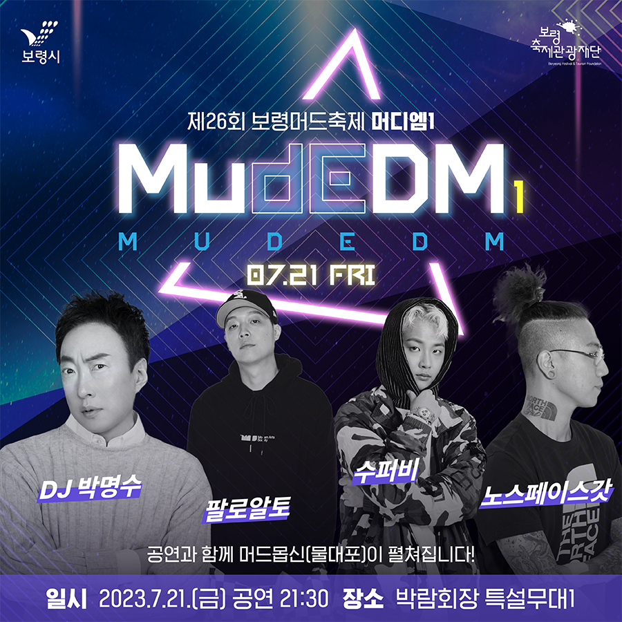 또한 매일같이 열리는 머드몹신&머디엠은 대천해수욕장의 밤을 더욱 뜨겁게 달굴 예정입니다. 머드몹신은 축제 참가자들이 함께하는 대규모 플래시몹으로, 음악과 춤으로 즐거움을 공유합니다. 머디엠은 축제장에서 진행되는 모든 공연을 실시간으로 중계하고, 축제 참가자들과 소통하는 프로그램입니다.
