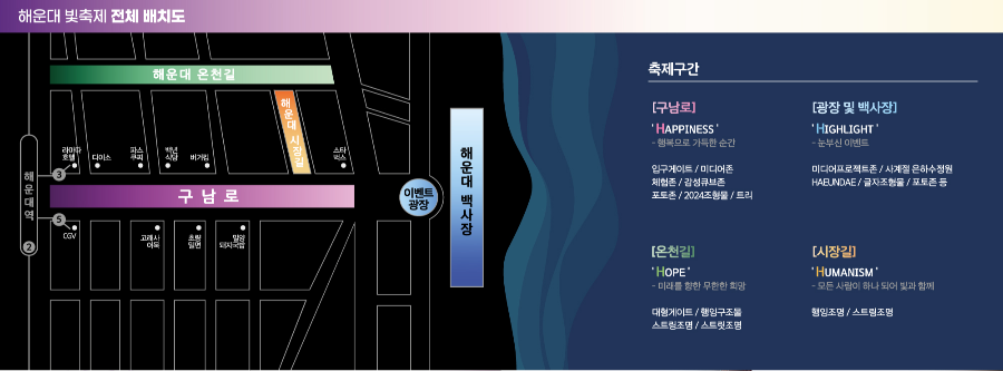 - Humanism은 구남로에 설치된 '해운대 빛축제 빛나는 사람들', '해운대 빛축제 빛나는 풍선들', '해운대 빛축제 빛나는 별들', '해운대 빛축제 빛나는 꽃들' 등으로 구성되어 있습니다. 이들은 해운대 빛축제의 감성 존으로, 사람과 자연의 조화를 표현하며, 방문객들에게 따뜻함과 위로를 전합니다.