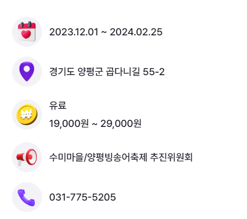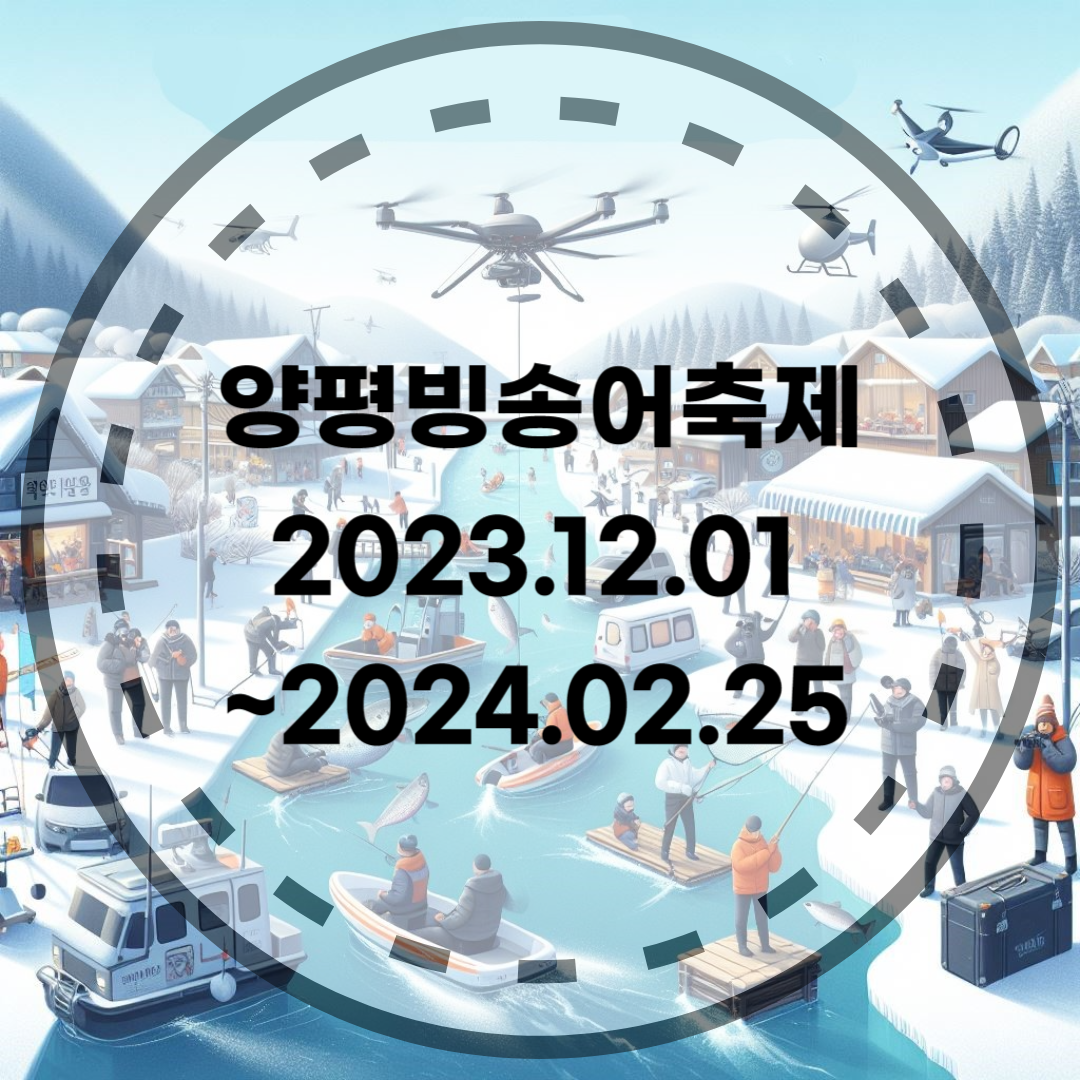 양평수미마을 빙송어 축제 기간 위치는 맑은 물로 유명한 양평의 수미마을에서 2023년 12월 1일부터 2024년 2월 25일까지 45일간 열리는 겨울 축제입니다. 빙어와 송어를 낚거나 잡을 수 있고, 다양한 눈과 얼음을 이용한 놀이와 먹거리가 준비되어 있습니다. 2013년 대한민국 농촌마을대상에서 대통령상을 수상한 수미마을은 365일 축제로 유명한 곳이며, 대한민국을 대표하는 축제로 발전해 나가고 있습니다 .