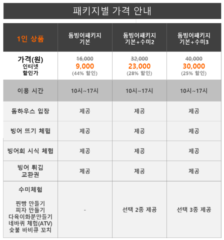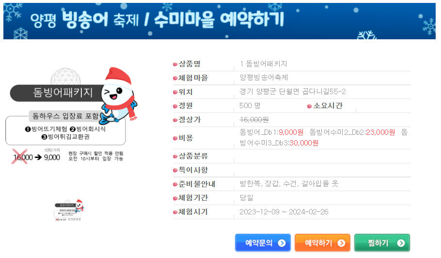 - 빙어낚시: 얼음 위에 구멍을 뚫고 빙어를 낚는 재미있는 체험입니다. 빙어는 1마리당 1,000원에 판매하며, 빙어를 낚은 후 바로 먹을 수 있습니다. 빙어낚시는 1인당 19,000원에 이용할 수 있습니다.