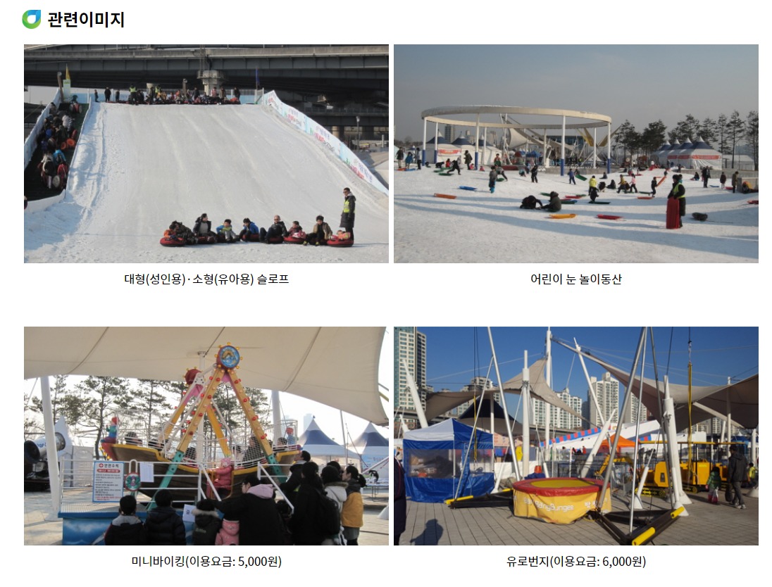 - 여의도 눈썰매장은 눈놀이동산, 놀이기구, 빙어 잡기 체험, 휴게시설 등의 부대시설도 갖추고 있습니다.