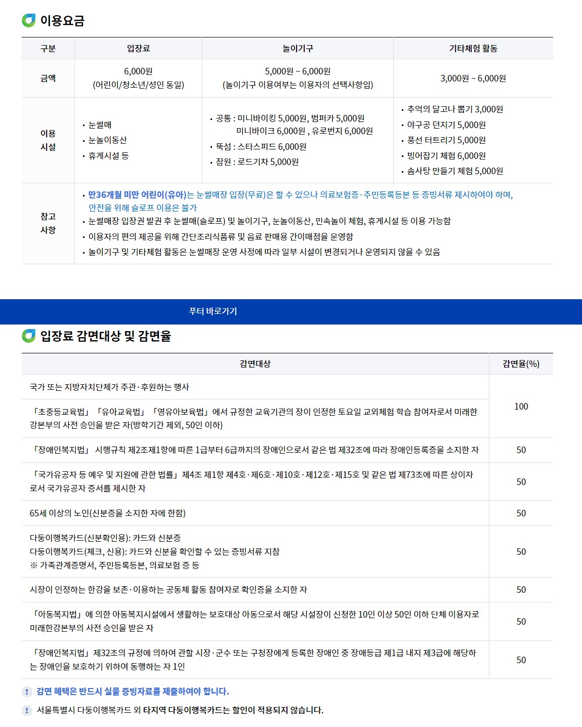 - 눈썰매장은 난이도와 연령에 따라 대형과 소형으로 구분되어 있으며, 눈놀이동산, 놀이기구, 빙어 잡기 체험, 휴게시설 등 다양한 부대시설도 이용할 수 있습니다.