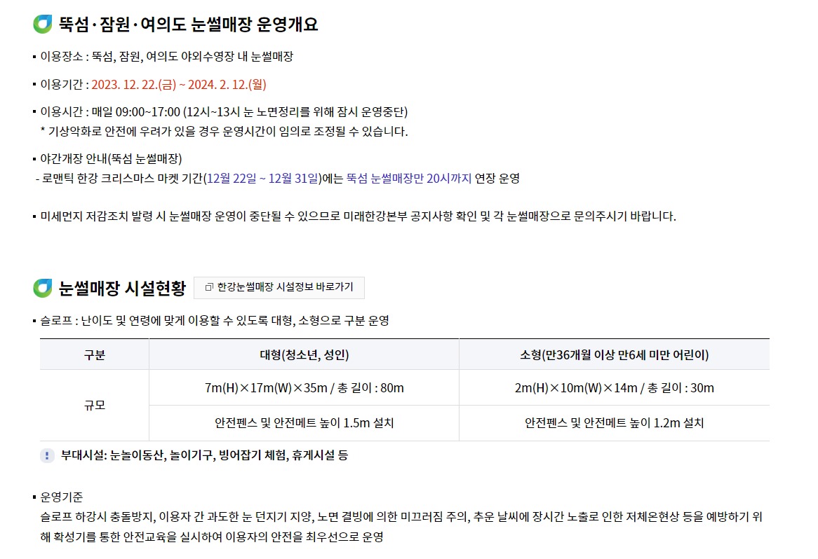 뚝섬한강공원 눈썰매장, 잠원한강공원 눈썰매장, 여의도 한강공원 눈썰매장 이용안내