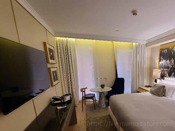 TV는 스마트 TV여서 원하는 채널을 볼 수 있었고, 미디어 허브도 있어서 스마트폰이나 노트북을 연결할 수 있었습니다. 욕실은 대리석으로 되어 있고, 레인 샤워기와 네츄라 비세 바르셀로나라는 고급 세면용품이 구비되어 있었습니다. 목욕가운과 슬리퍼도 준비되어 있었고, 금고와 전화, 책상 등도 갖춰져 있었습니다. 객실 유형에 따라서는 도시 전망이나 테라스가 있는 객실도 있습니다.