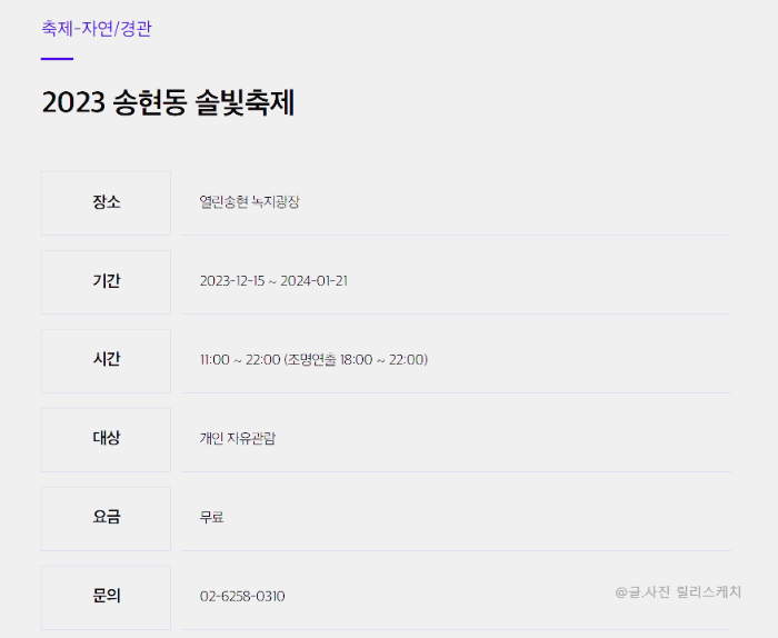 송현동 솔빛축제는 2023년 12월 15일부터 2024년 1월 21일까지 열린 송현 녹지광장에서 열리는 빛 축제로, ‘신비로운 빛의 정원을 거닐며 초자연을 만나다’라는 주제로 다채로운 빛의 오브제와 조형물을 선보입니다.
