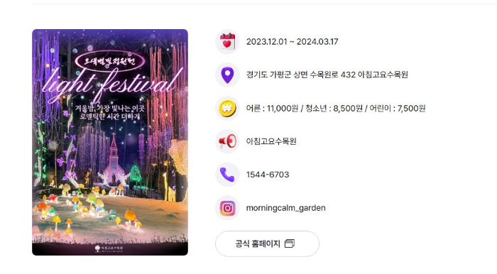 이번에는 아침고요수목원 오색별빛정원전의 기본 정보, 입장료, 위치, 기간, 이벤트, 주차에 대해 알아보겠습니다.