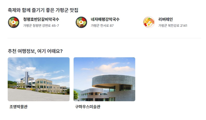 - 만약 주차장이 만차인 경우에는 가평군청 주차장이나 가평역 주차장을 이용하실 수 있습니다. 이 경우에는 버스나 택시를 이용하여 축제장까지 이동하셔야 합니다.