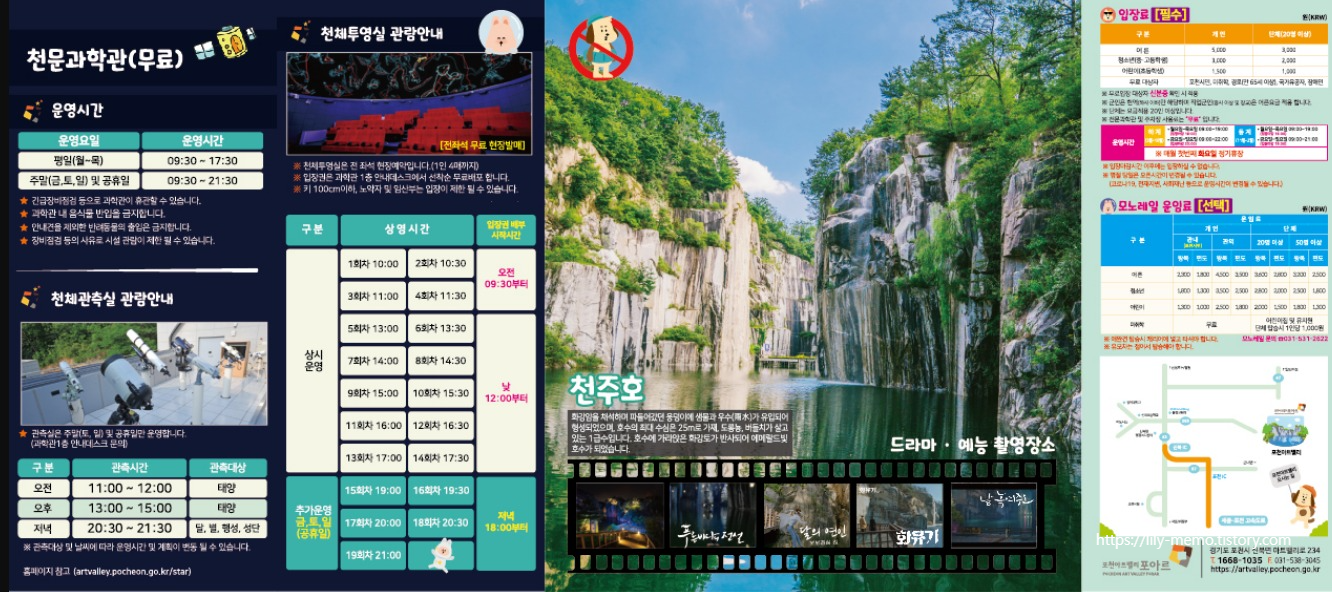 포천아트밸리의 천문과학관은 우주와 천문학에 관심이 있는 분들에게 추천하는 곳입니다. 천문과학관은 산정호수와 조각공원 사이에 위치하고 있으며, 입장료는 포천아트밸리 입장료에 포함되어 있습니다. 천문과학관의 면적은 약 1,000㎡이고, 우주와 천문학에 관한 다양한 전시와 체험을 할 수 있습니다.
