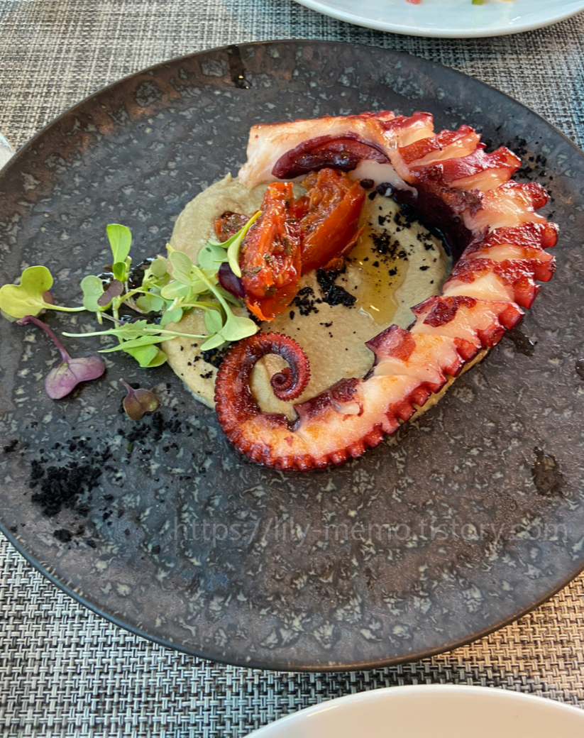 타파스, 플라티요스, 시그니처 요리 등 지중해식과 바비큐 요리를 선보이며, 특히 1월부터 3월까지는 스위스 치즈 퐁듀를 즐길 수 있습니다.