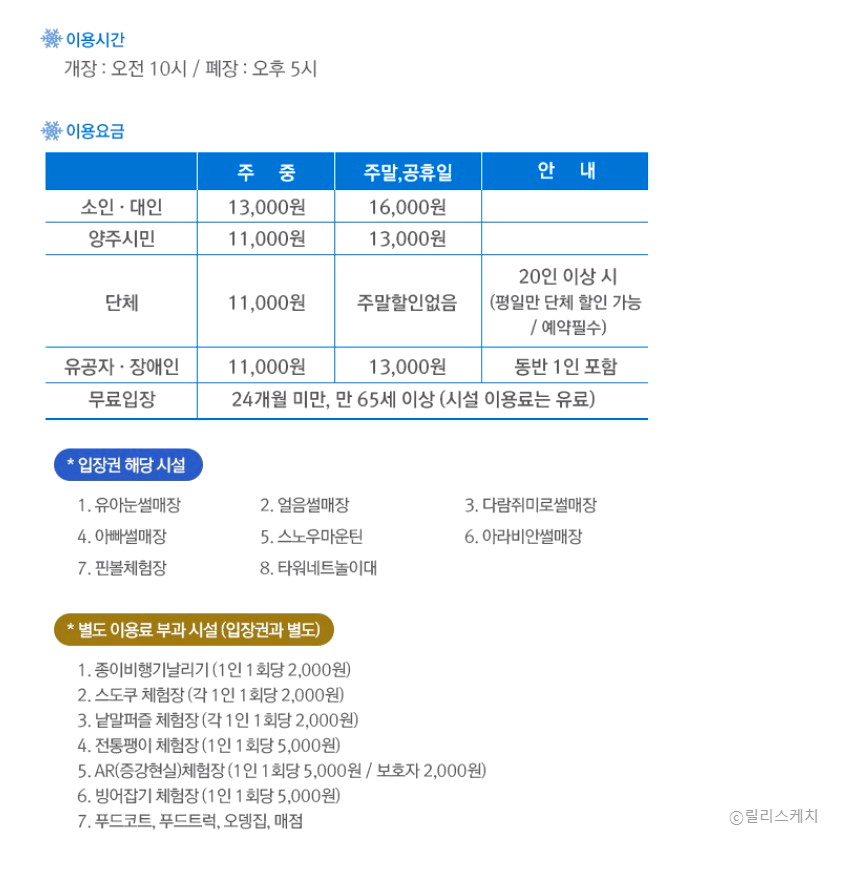 양주 눈꽃 축제는 겨울의 기적을 만날 수 있는 곳으로 눈썰매와 눈조각 등의 다양한 체험과 전시를 즐길 수 있습니다. 입장료와 별도 이용료 부과 시설의 금액, 예매 방법, 주차와 교통편을 잘 알아두시면 좋습니다.
