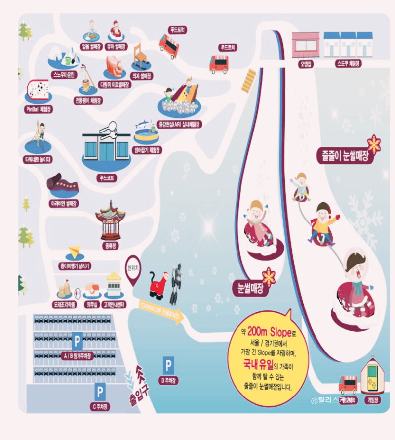 -눈썰매장은 입장료에 포함되어 있으므로, 별도의 비용을 내지 않고 무제한으로 이용할 수 있습니다.