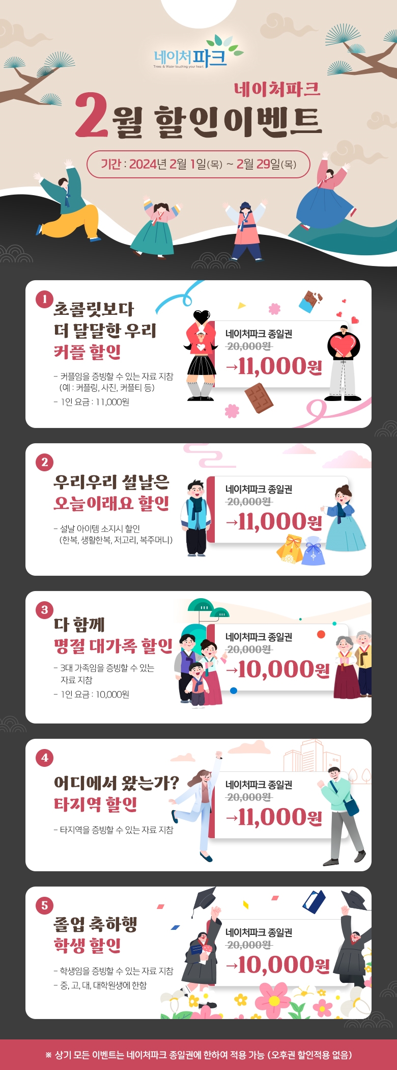 설날 아이템을 소지하신 분들에게는 네이처파크 이용요금이 20,000원에서 11,000원으로 할인됩니다. 한복, 생활한복, 저고리, 복주머니 등 설날 분위기를 느낄 수 있는 아이템이면 모두 가능합니다.