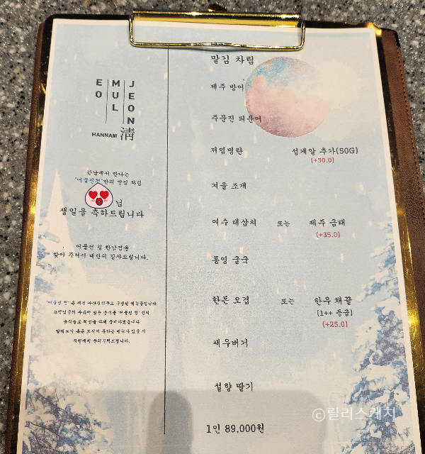 어물전청 한남은 가성비 최고의 한남동 오마카세 맛집이라고 할 수 있습니다. 1인 89,000원에 12종의 해산물 맡김 차림 코스요리가 나옵니다. 옵션으로 성게알, 병어, 한우 채끝 등을 추가할 수 있습니다. 저는 생일 기념으로 방문하여 미역국과 벌집크로플을 추가로 받았는데 정말 감동적이었습니다.