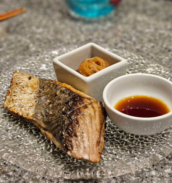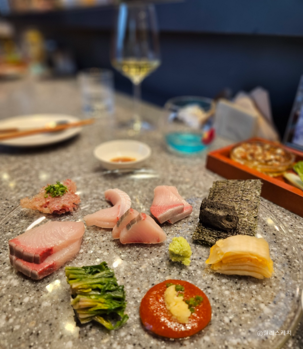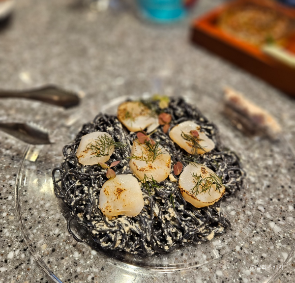 특히 제주 방어와 함께 먹을 묵은지, 쌈장, 고추냉이, 김, 시금치 등이 색다른 모양의 그릇에 담겨 있어서 플레이팅이 너무 예뻤습니다. 저염 명란으로 만든 파스타 위에 두툼한 가리비 관자가 올려져 있어서 제일 맛있었어요.