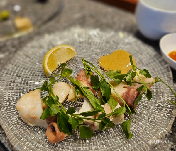 맡김차림 9코스의 메뉴는 처음에 웰컴 드링크로 상큼한 칵테일을 제공해 주시고 웰컴 푸드로 시그니처 메뉴인 아귀 간 아이스크림을 콘 위에 올려서 내어주십니다. 아귀 간이라고 하면 비린맛이 날 것 같지만 고소하고 풍미가 있어서 입맛을 돋우는데 좋습니다.