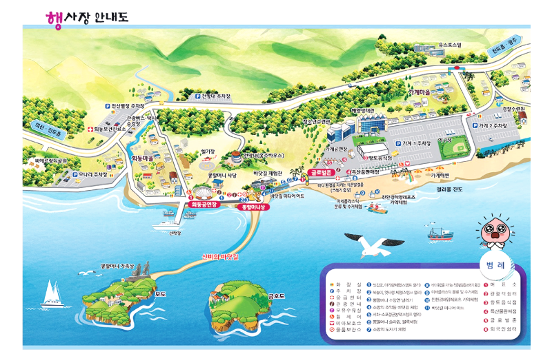 - 바닷길 횃불퍼레이드는 바닷길이 열리기 전에 관광객들이 횃불을 들고 바닷길을 따라 걷는 행사로 바다 위에 펼쳐지는 환상적인 불빛의 풍경을 감상할 수 있습니다.