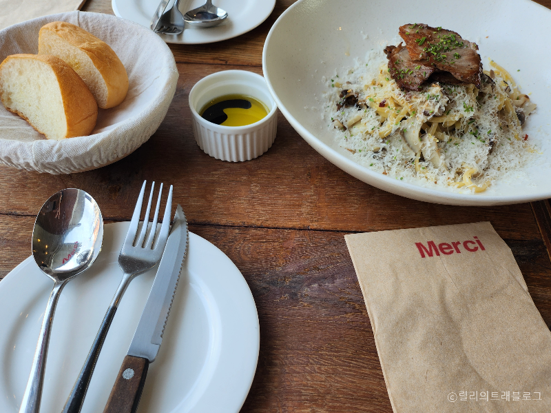 라자냐 위에 눈처럼 올려진 치즈는 그 맛을 한층 더 고소하게 만들어주었습니다. 제가 이전에 맛보았던 라자냐들과 비교할 때 메르시 라자냐의 맛은 조금 독특하면서도 풍미가 있었습니다. 그리고 라자냐를 들어 올릴 때마다 치즈가 살짝 늘어나는 모습에서도 그 맛의 풍성함을 예상할 수 있었습니다. 메르시에서 라자냐를 맛본 이후에 라자냐에 대한 제 기준이 한 단계 업그레이드되었다고 느껴졌습니다.