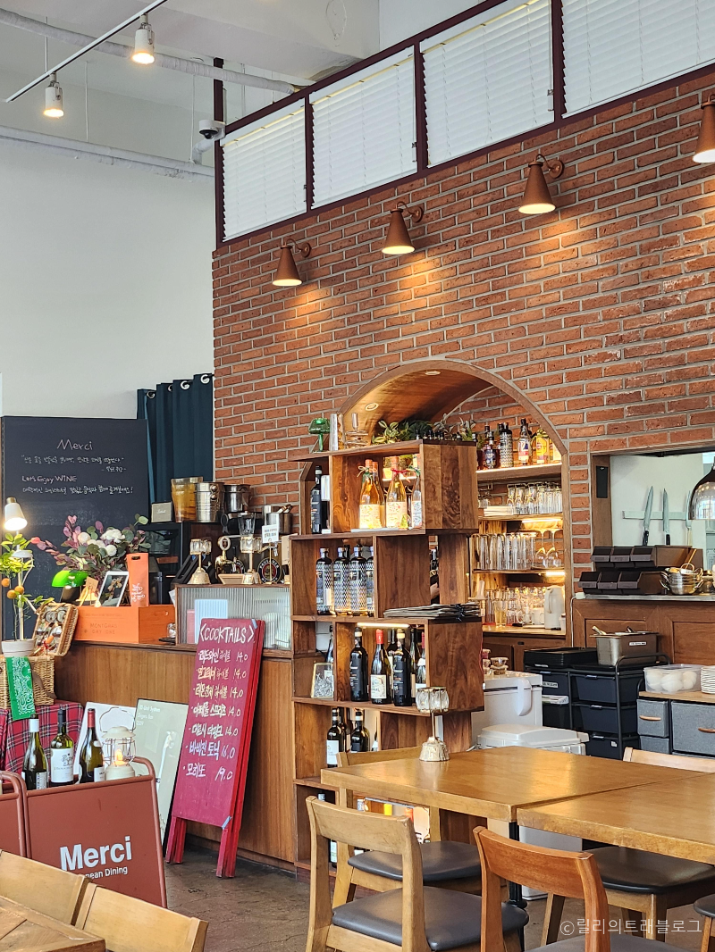 나무로 만든 테이블과 의자, 벽장, 바카운터 등의 인테리어가 따뜻한 분위기였습니다. 메르시는 총 50석의 좌석이 있으며 매장 기본 이용 시간은 3시간입니다. 3시간 이상 이용 시에는 직원에게 사전 문의가 필요합니다.