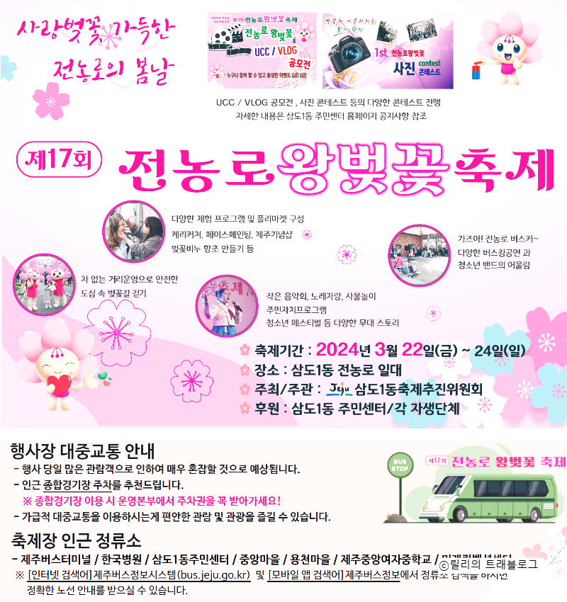 따스한 봄바람과 함께 찾아오는 제주 벚꽃명소 제17회 전농로 왕벚꽃축제는 2024년 3월 22일부터 24일까지 삼도1동의 전농로에서 개최됩니다. 이 축제는 '사랑벚꽃 가득한 봄날’이라는 주제 아래 방문객들에게 봄의 정취를 만끽할 수 있는 기회를 제공합니다. 차량 통행이 제한된 거리에서는 사랑하는 사람들과 소중한 추억을 쌓고 다채로운 문화 체험을 통해 봄을 실감 나게 경험할 수 있습니다.