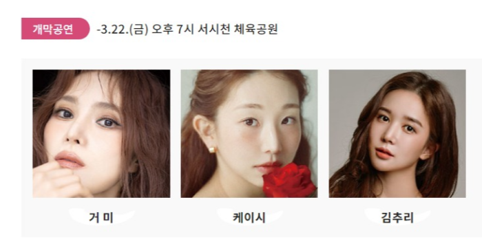 저녁 7시부터 9시까지 이어지는 이 축제 초대가수로 대한민국을 대표하는 가수 거미, 케이시, 김추리가 무대에 올라 관객들에게 잊지 못할 공연을 선사할 예정입니다. 이들의 감미로운 목소리와 벚꽃이 어우러져 봄밤의 정취를 더할 것입니다.