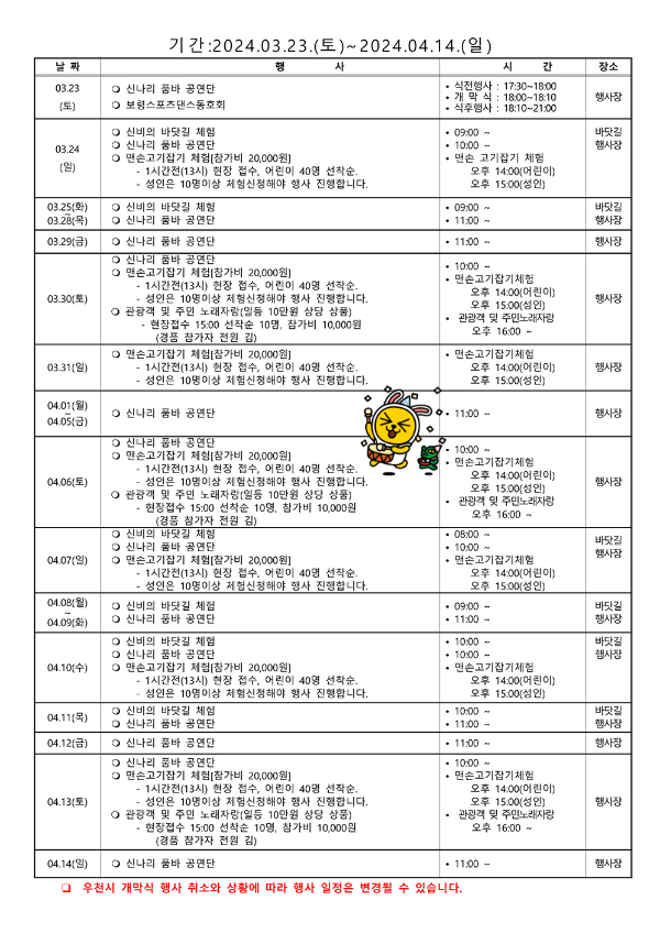 - 맨손 고기 잡기 체험은 참가비 2만 원이며 축제의 특별한 경험 중 하나인 맨손 고기 잡기 체험은 어린이부터 어른까지 누구나 참여할 수 있는 프로그램입니다. 이 체험은 3월 24일, 29일, 30일과 4월 5일, 6일, 7일, 12일에 진행되며, 참가자들은 직접 바닷물에 손을 담그고 물고기를 잡는 짜릿함을 경험할 수 있습니다. 가족 단위 방문객들에게 특히 인기가 많으며, 자연과 함께하는 즐거움을 만끽할 수 있는 기회를 제공합니다.