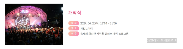 다양한 장르의 거리공연과 함께 특별히 마련된 차 없는 거리에서는 버스킹 아티스트들의 생동감 넘치는 공연이 펼쳐집니다. 이곳에서는 재즈, 팝, 클래식, K-팝 등 다양한 음악이 어우러져, 꽃의 아름다움과 함께 활기찬 분위기를 만끽할 수 있습니다.