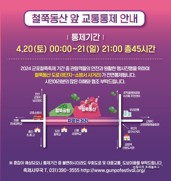 군포철쭉축제의 동산 주변 도로는 관람객들의 안전과 원활한 행사 진행을 위해 전면 통제됩니다. 특히 8단지 사거리부터 소방서 사거리까지의 구간이 통제되며 이는 4월 꽃축제 기간인 4월 20일 자정부터 21일 21시까지 적용됩니다. 방문하실 때는 이러한 교통통제 정보를 참고하여 불편 없이 즐거운 시간을 보내시길 바랍니다.
