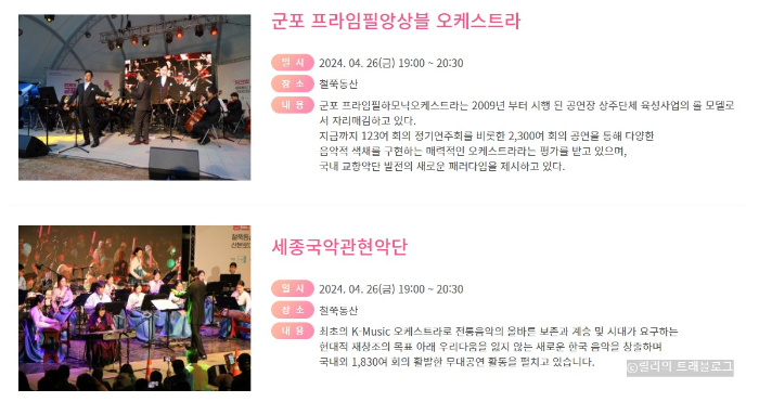 군포철쭉축제는 방문객들에게 문화의 향연을 선사합니다. 군포 프라임필앙상블 오케스트라의 클래식 공연은 매년 관객들의 마음을 사로잡으며, 세종국악관현악단의 전통음악 공연은 우리 음악의 아름다움을 재조명합니다.