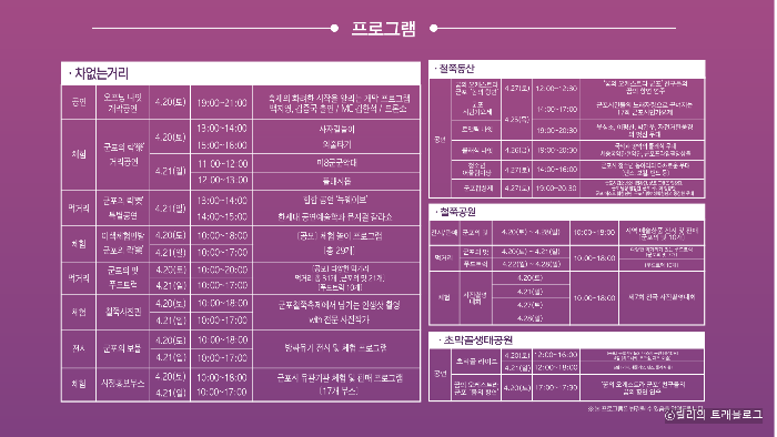 22만 그루가 넘는 나무가 만개하는 4월 중순부터 말까지 꽃축제가 열립니다. 이 기간 동안 군포시는 방문객들에게 봄의 정취와 함께 힐링의 기회를 제공합니다. 군포철쭉축제는 철쭉꽃이 만발한 동산은 방문객들에게 잊지 못할 경험을 선사하며, 군포시민들의 자긍심을 높여주며 지역 사회의 화합과 문화 발전에도 기여하고 있습니다.