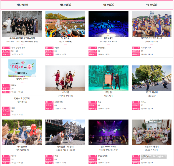 이 모든 공연은 축제를 찾은 모든 이들에게 봄날의 아름다운 추억을 선사합니다.