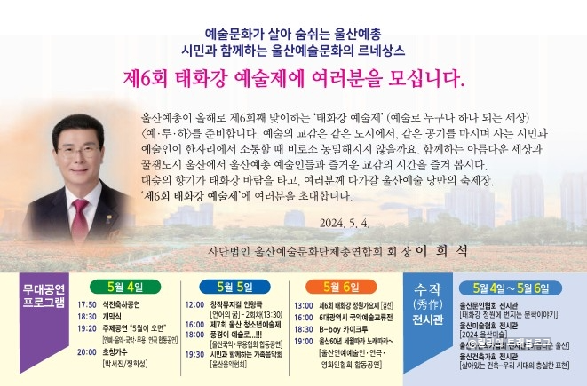· 5월 6일(월)에는 태화강 정원가요제 결선에서 시민들의 열정적인 노래를 감상할 수 있습니다. 국악 교류전에서는 각 지역의 독특한 음악을 즐길 수 있으며, 예총 연예, 연극, 영화, 예술가 협회 연합 공연은 화려한 피날레를 장식할 것입니다.