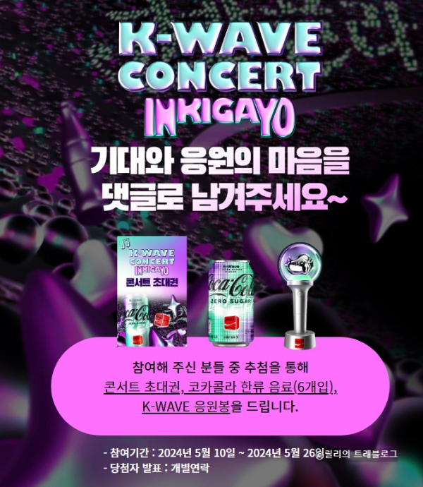 콘서트 개최를 기념하여 팬들의 설렘을 응원하는 이벤트가 진행됩니다. 이벤트에 참여하여 댓글을 남기신 분들 중 추첨을 통해 콘서트 입장권, 코카콜라 한류 음료 (6개입), K-WAVE 응원봉 등이 증정됩니다.