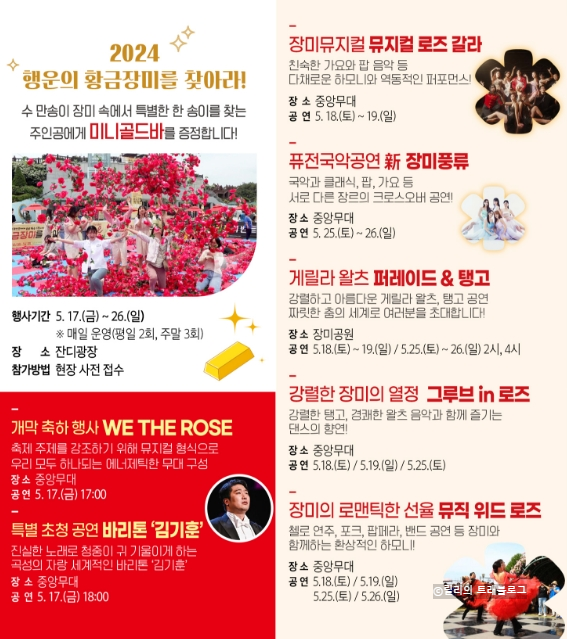 2024년에는 5월 17일부터 26일까지 총 10일간 개최되는 이번 축제에는 가수 하이키, 김연자, 문희옥 등 축하 공연과 다양한 볼거리, 즐길 거리가 준비되어 있습니다.