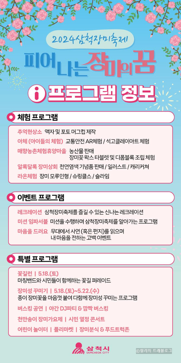 삼척 장미축제는 아름다운 장미와 함께 다채로운 프로그램으로 가득한 즐거운 축제입니다. 이번 봄에는 사랑하는 사람들과 함께 삼척으로 떠나 장미의 향연을 마음껏 즐겨보세요!
