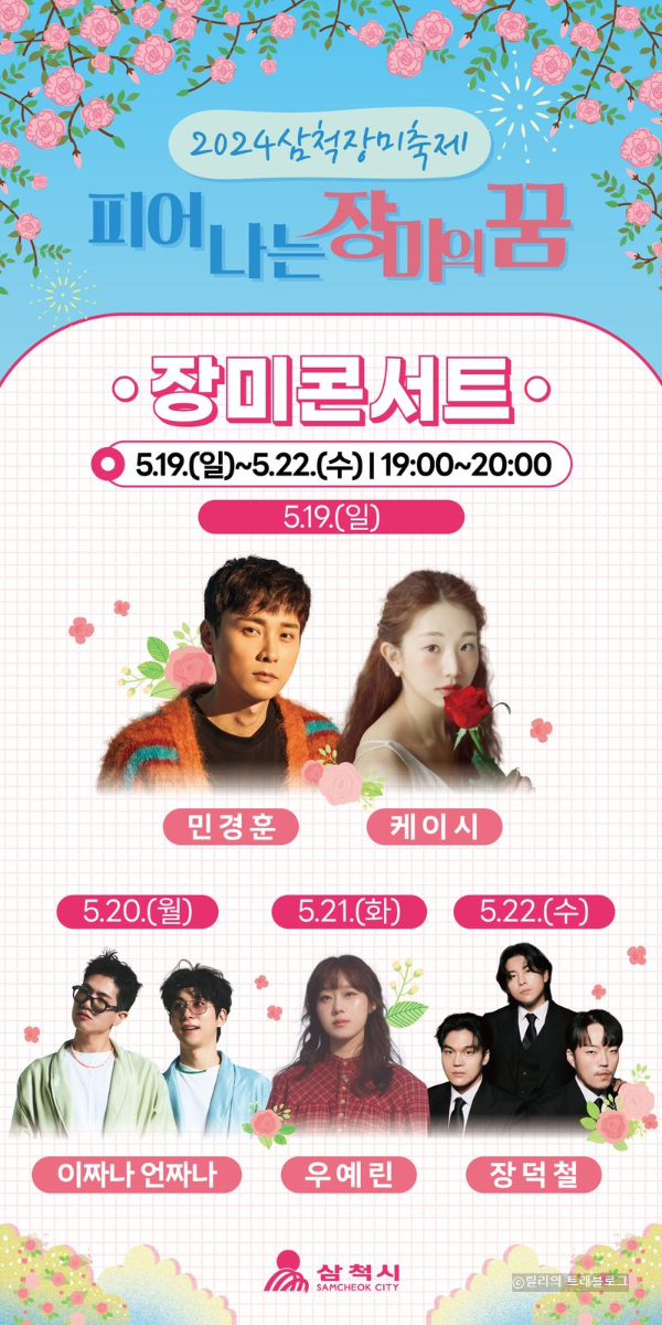 삼척 장미축제의 하이라이트 중 하나는 장미 콘서트입니다. 콘서트는 매일 오후 7시부터 8시까지 진행되며, 유명 가수들의 공연이 펼쳐집니다.