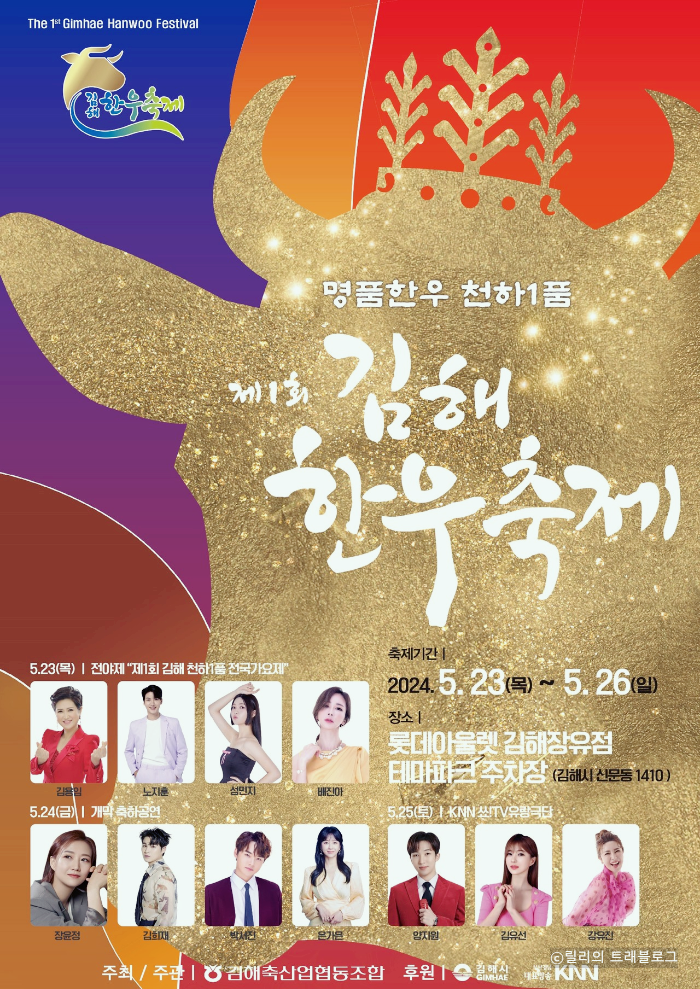 제1회 김해한우축제는 김해시의 우수 축산물인 김해한우의 품질과 맛을 널리 알리는 동시에, 다양한 공연과 이벤트를 통해 즐거운 시간을 보낼 수 있는 축제입니다. 박서진, 김희재, 장윤정, 은가은 등 유명 가수들의 공연을 비롯해 다양한 프로그램들이 준비되어 있어, 가족, 친구, 연인과 함께 방문하기에 최적의 축제입니다. 2024년 5월 23일부터 5월 26일까지 열리는 김해한우축제에 꼭 방문하셔서 특별한 경험을 만끽해보세요!