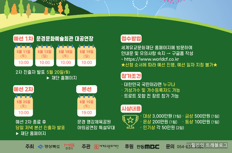 행사에 대한 자세한 정보나 문의 사항은 세계유교문화재단으로 문의해 주세요. 더 많은 정보는 재단 홈페이지에서 확인하실 수 있습니다. 2024 문경트롯가요제는 트로트를 사랑하는 모든 이들에게 열려 있습니다. 참가자가 아니더라도 축제의 열기를 함께 느껴보세요. 많은 관심과 참여 부탁드립니다!