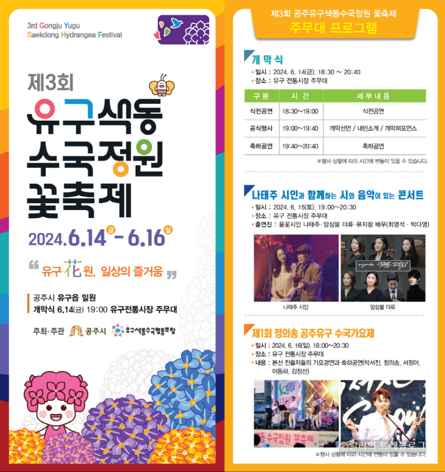 이번 공주 유구 색동수국정원 꽃축제는 6월 14일 금요일부터 6월 16일 일요일까지 진행됩니다.
