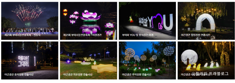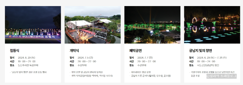 궁남지 빛의 향연은 LED 조명과 홀로그램을 활용한 화려한 빛의 공연으로, 한여름밤을 빛으로 물들입니다.