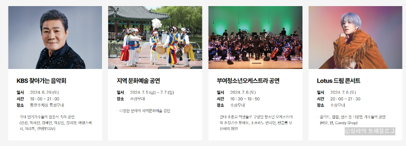 다양한 공연 프로그램이 준비되어 있어 방문객들의 귀와 눈을 즐겁게 할 예정입니다. '궁남지 트롯 콘서트', 'Lotus 드림 콘서트', '지역문화예술 공연', '부여청소년오케스트라 공연', '한여름의 연꽃음악회' 등 다양한 장르의 공연이 기다리고 있습니다.