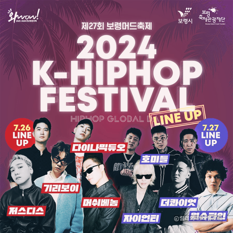 - 7월 26일(금) & 27일(토): 힙합페스티벌이 진행됩니다. 저스디스, 기리보이, 머쉬베놈, 다이나믹듀오, 원슈타인, 호미들, 더콰이엇, 자이언티 등 유명 아티스트들이 출연합니다.