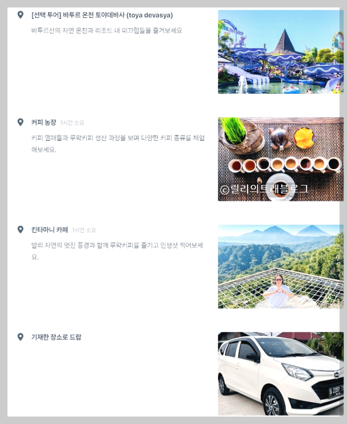 아름다운 자연 속에서 현지 커피 문화를 체험할 수 있는 커피 농장 방문과 킨타마니 카페에서의 루왁 커피 시음도 포함되어 있어 다양한 즐길 거리를 만끽할 수 있답니다.