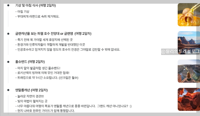 그랜드캐년에서의 여행은 하루 또는 이틀 일정으로 계획할 수 있습니다. 하루 일정이라면 사우스 림과 웨스트 림을 중심으로 주요 전망대를 돌아보는 코스가 적합합니다. 이틀 일정이라면 첫날은 사우스 림과 웨스트 림을 둘러보고, 둘째 날에는 노스 림에서 한적한 시간을 보내며 그랜드캐년의 다양한 매력을 즐길 수 있습니다.
