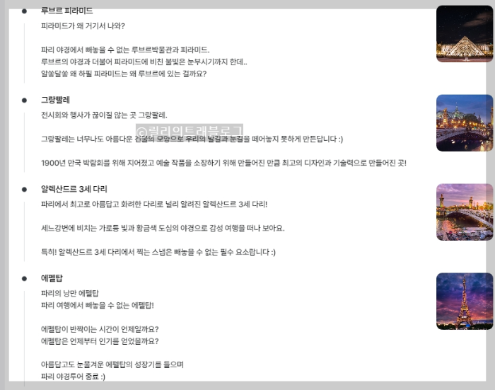 이렇게 하루 동안 파리의 주요 명소를 중심으로 여행 일정을 계획해 보았습니다. 파리는 어디를 가더라도 아름다움과 낭만이 가득한 도시로, 한 걸음 한 걸음마다 특별한 추억을 남기게 됩니다. 파리 여행을 계획하고 계신다면, 이 코스를 참고하여 잊지 못할 여행을 만들어 보세요!