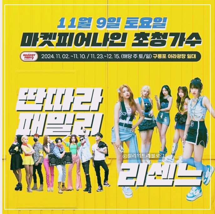 마켓피어나인 축제는 매주 토요일마다 특별한 초대 가수들의 공연으로 더욱 다채로운 분위기를 자아냅니다. 축제의 개막식인 11월 9일 저녁 8시에는 이찬원, 딴따라패밀리, 리센느가 무대에 오르며, 관객들에게 활기찬 시작을 알릴 예정이었으나 아쉽게도 안전상의 이유로 이찬원 님의 공연이 취소되었습니다.
