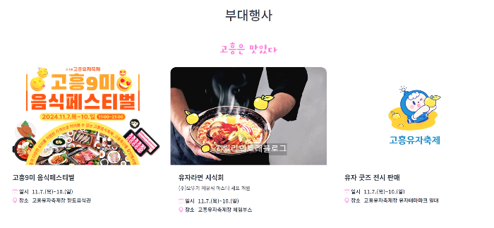 매년 열리는 고흥유자축제는 전국 최대 유자 생산지인 고흥에서 지역의 특산물 유자를 널리 알리기 위해 열리며, 유자향 가득한 다양한 체험과 공연으로 가을 여행지로 추천드리고 싶은 축제 중 하나입니다. 이번 축제에는 초대가수 박서진, 박지현, 김필 등이 출연하여 축제를 더욱 빛내줄 예정이니 많은 분들이 함께 즐기셨으면 좋겠습니다.