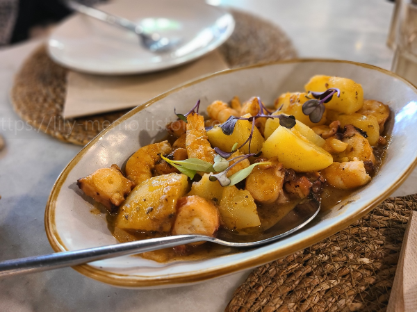 갈리시아식 파이는 다양한 재료를 넣고 튀김 반죽으로 만든 것으로 저는 해산물과 채소가 들어간 것을 골랐습니다. 반죽이 쫄깃하고 부드럽고 재료가 신선해서 맛있었습니다. 가리비에 망고 오일 요리는 식당의 시그니처 메뉴였습니다.