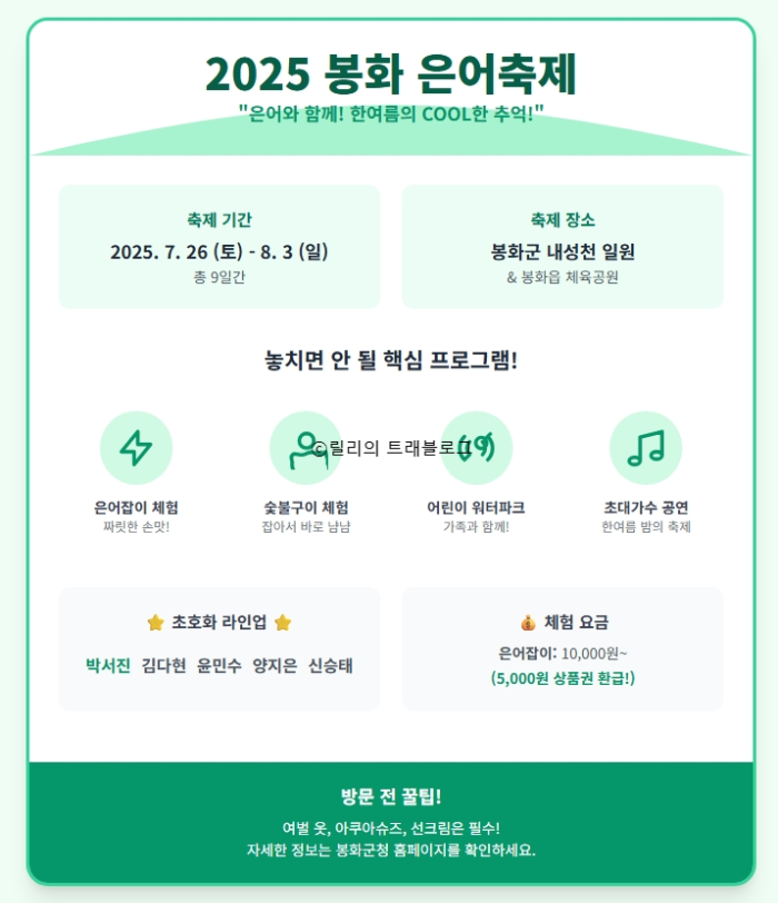 2025년 7월 26일부터 8월 3일까지 아름다운 봉화에서 여러분의 여름을 가장 빛나는 추억으로 채워보시길 바랍니다.
