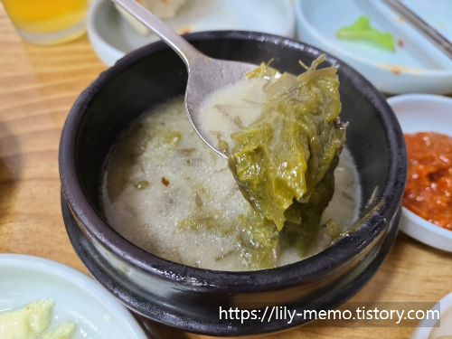 몸국도 서비스로 제공되는데 돼지뼈를 삶은 육수에 모자반과 메밀가루를 넣어 만든 국이었습니다. 삼계탕 육수 같은 맛이 나서 고기와 함께 들이키기 좋았습니다.